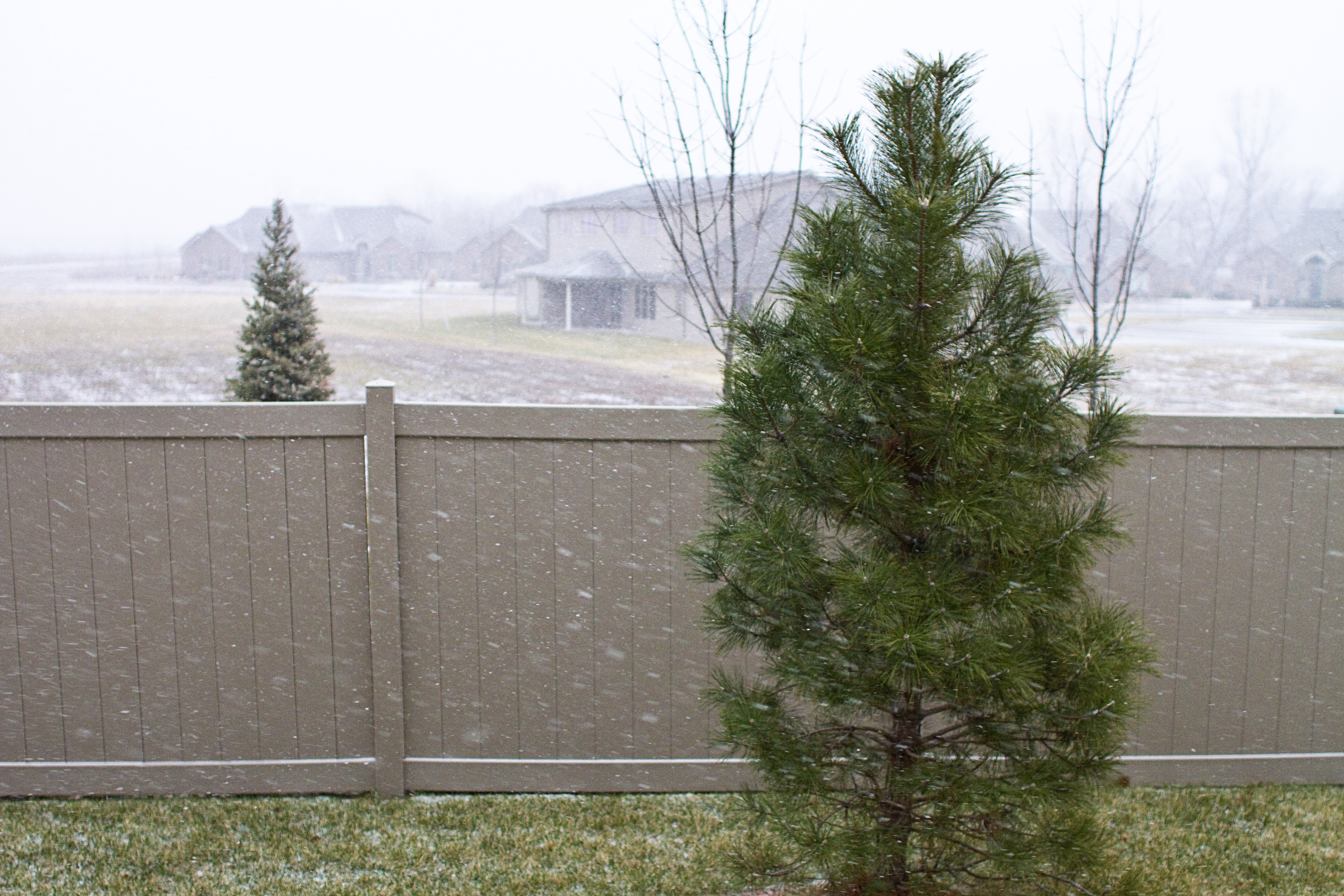 Yesterday, it was 56 degrees and sunny. Today, it was just below freezing, gray, gusty, and snowy. It was hard to tell if it was falling, or just blowing straight across the ground! Taking a photo from just inside the back door was as far as I was willing to venture out into it…