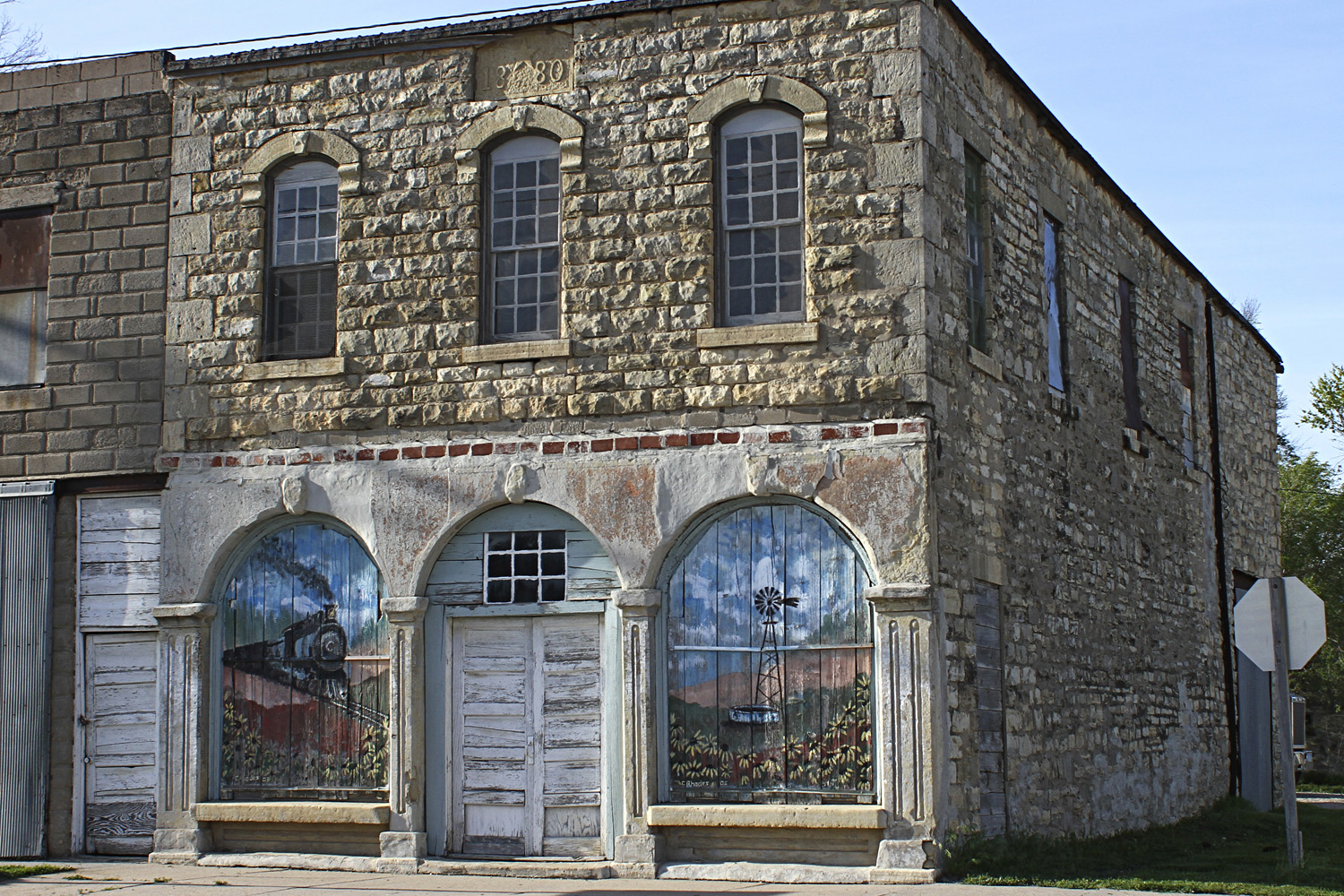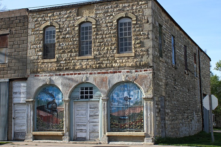 I spent today celebrating with my friend Stacy at her bridal shower! It was held at the Wichita Boathouse and I had several good photo opps while I was there, but my favorite of the day ended up being something completely random. On my way home, I pulled off highway 50 for a quick stop and noticed this old building. I love the scenic murals painted on its boarded up windows… and also that it’s from 1880!