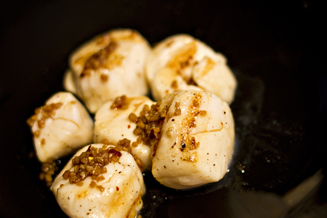 Tonight we whipped up a quick dinner and it turned our pretty great… grilled scallops with an soy/garlic dipping sauce and stir-fry veggies and noodles. Just a quick shot as we plated them.
