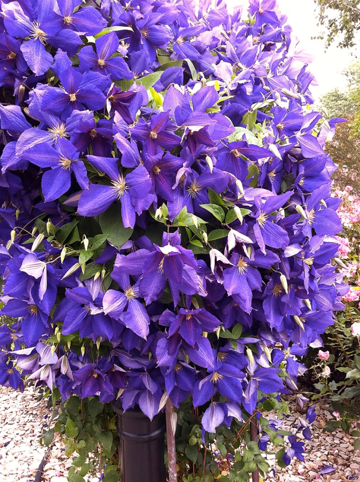 These beautiful purple flowers are blooming all over town. Mailboxes seem to be their home of choice. (Believe it or not, there IS a mailbox under there.)