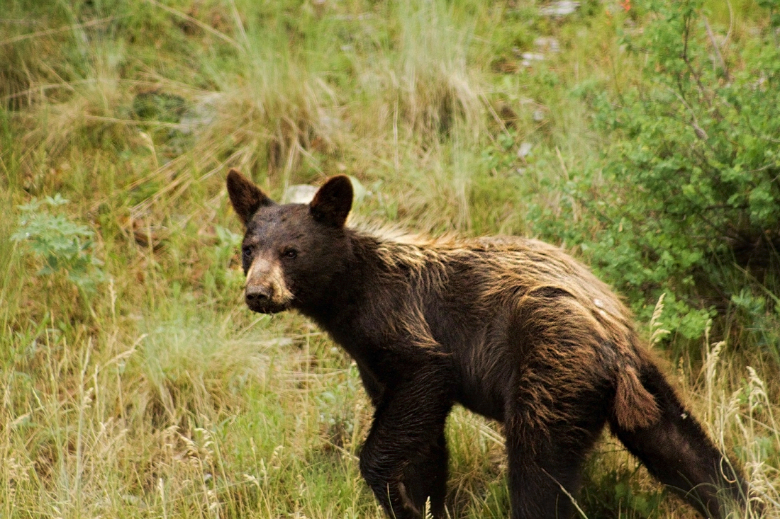 Then, on our way back into town Andy spotted a bear – FINALLY! I have no idea how he saw it from so far away, but I whipped out my camera and zoom lens and started shooting. Next thing I know we’re following this little brown bear along the road and through neighborhoods, watching every move, with me trying frantically to keep him in the frame. He couldn’t have cared less that we were there! He carried about his business, looking for food – digging, checking bushes, tearing at logs, then casually strolling along. He wandered up and down the hills along the road, up into people’s yards (and quite possibly onto someone’s deck), and then onto the next grassy area. He was actually very small and hadn’t grown into his ears yet, but he wasn’t scared of us and didn’t seem to mind getting the paparazzi treatment. 🙂
