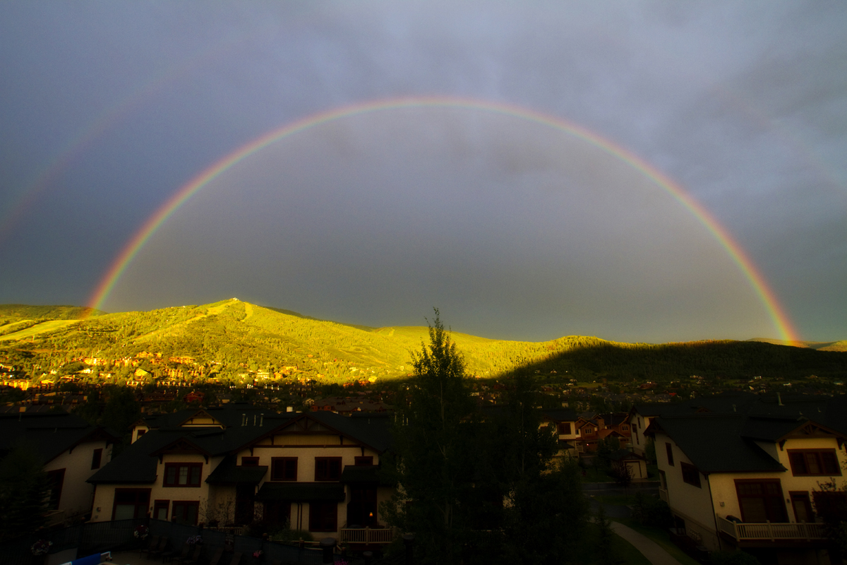 We rode the gondola in Steamboat Springs today and spent some time walking around at the top of the mountain. I got some nice photos up there, but this one of a double rainbow was the most unique of the day. Though, I didn’t get quite as excited as this guy – “double rainbow all the way, woo!” π