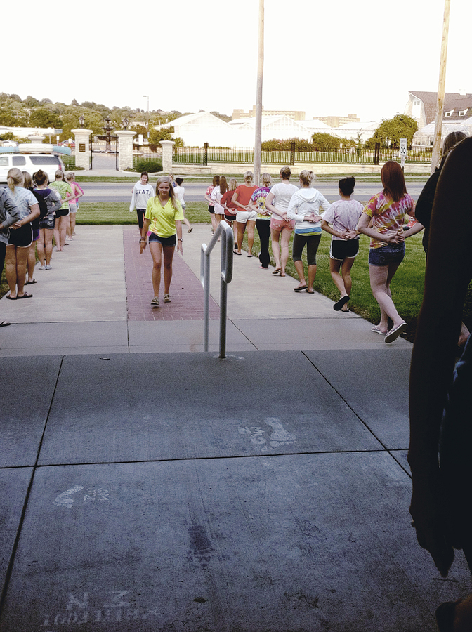 We really kicked recruitment practice into full gear today. It was a full day of conversation workshops, event practice, learning songs, working within rotation groups, and walk-out practice shown here. While a little bizarre, this is the method that our campus uses to walk out and greet the incoming potential new members, then greet them and walk them into the chapter house for events.