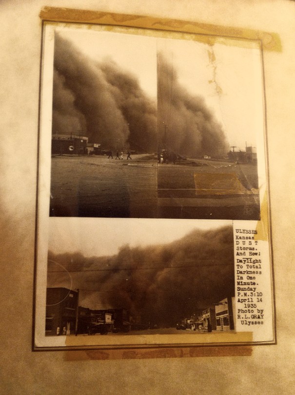 We had an unexpected trip to Lawrence today to see Andy’s grandparents. His grandpa wasn’t doing well and we went to visit him. On a break from the nursing home, his grandma was showing off her new apartment and pulled out this picture. The caption reads: “Ulysses Kansas Dust Storms. And How! Daylight to total darkness in one minute. Sunday P.M. 3:10 April 14 April 14 1935 Photo by R.L. Gray Ulysses” I can’t imagine!